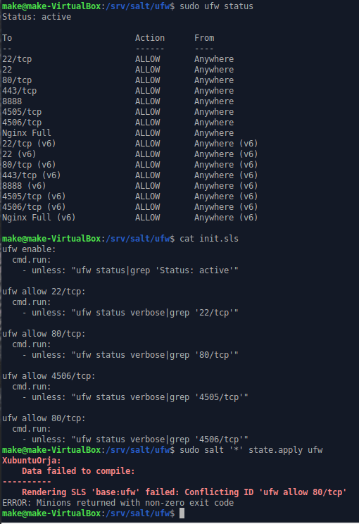 1. Githubissa olevassa versiossa moduulista oli jäänyt ufw:n kohdalla virhe, jonka nyt korjasin. Tilan näyttökaappauksessa huomaa, että sen porttien määritteet eivät täsmää avattaviin portteihin. Kahdella määritteellä on myös sama nimi mikä aiheutti saamasi virheen. Eli meikäläisen moka, sori 👌