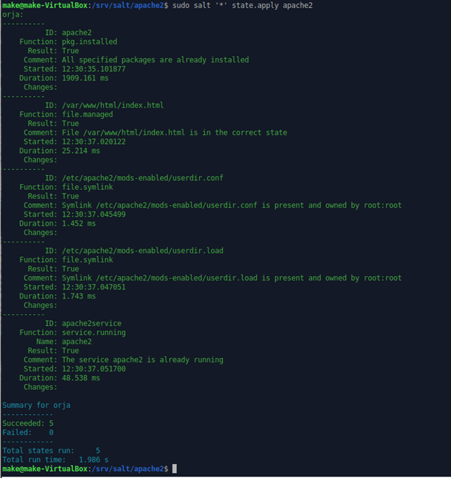 Ajetaan tämä init.sls seuraavalla komennolla muutaman kerran.