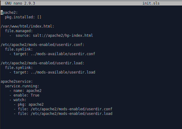 Seuraavaksi muokataan init.sls tiedosto seuraavanlaiseksi käyttäen apuna Tero Karvisen mallia (http://terokarvinen.com/2018/apache-user-homepages-automatically-salt-package-file-service-example).