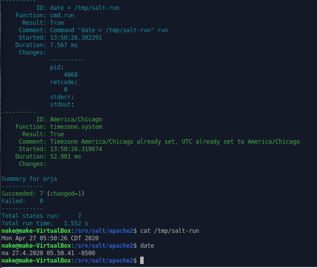 Saadaan seuraava lopputulos ja tulos voidaan testata cat /tmp/salt-run – komennolla. Tämä näyttää milloin on viimeksi päivitetty kyseistä moduulia. Ja date -komennolla nähdään mikä päivä ja kellonaika on, Chicagossa kello on 7h jäljessä, joten homma toimii.