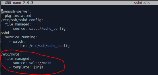 Seuraavaksi muokataan sshd.sls tiedostoa ja luodaan sinne tila (file.managed), jonka avulla pystytään hallitsemaan motd tiedostoa, joka löytyy /etc/motd hakemistosta.