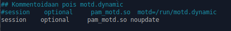 Käydään muokkaamassa /etc/pam.d/sshd tiedostoa. Tästä tiedostosta kommentoidaan vain pois motd.dynamic kohta, jolloin kaikki ylimääräinen poistuu motd:sta.