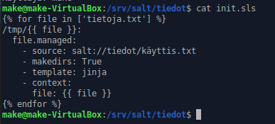 Aloitetaan tekemällä tiedot kansio /srv/salt hakemistoon. Luodaan tähän kansioon kaksi eri tiedostoa, init.sls ja käyttis.txt.