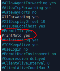 Tämän jälkeen muokataan myös sshd_config tiedostoa. Tässä tiedostossa vaihdetaan PrintMotd kohdan perään yes (aikaisemmin perässä oli no).