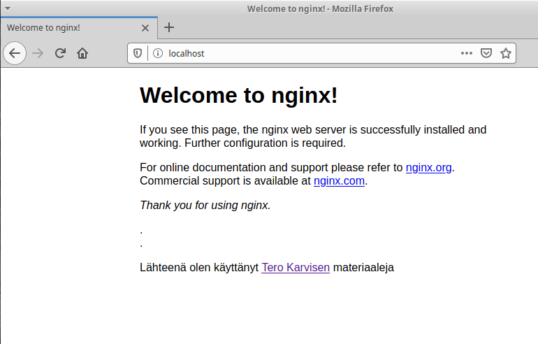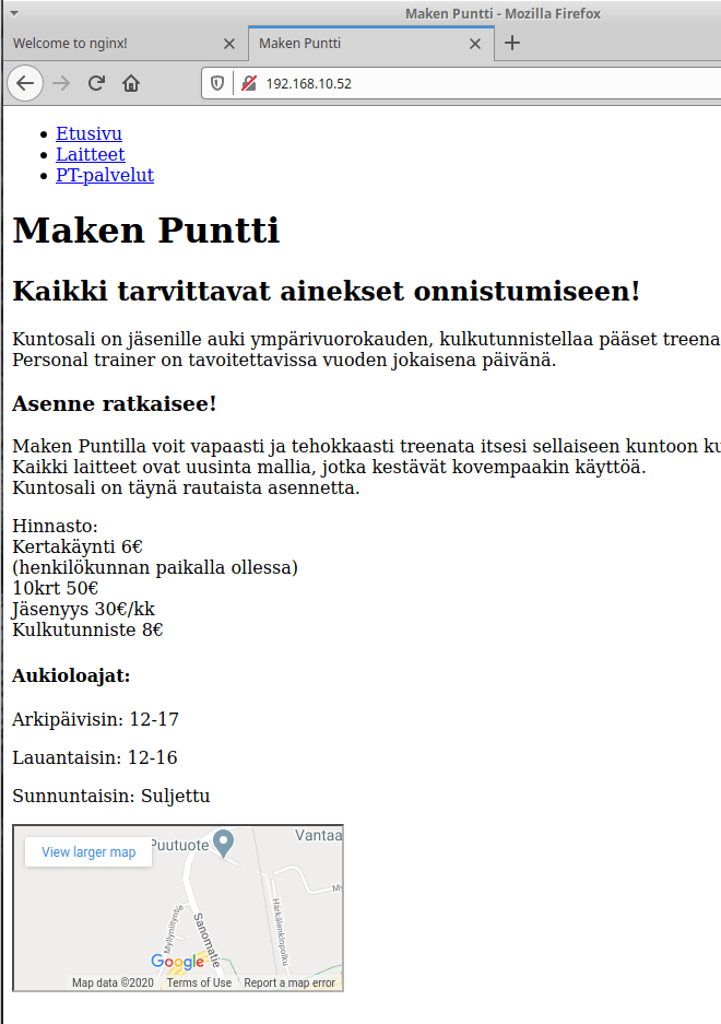Olen aikaisemmassa tehtävässä asentanut Nginx webpalvelimen ja muuttanut kotisivua hiukan, joten tehdään muita muutoksia. Lähtökohta on seuraava: