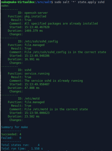 Tämän jälkeen ajetaan sshd.sls moduuli muutaman kerran.