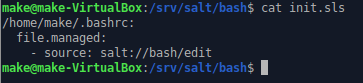 Testin jälkeen voidaan tehä muutoksia saltin avulla. Ensin tehdään oma kansio bashille /srv/salt kansioon, johon luodaan init.sls tiedosto. Tämän lisäksi kopioidaan /.bashrc juuri luomaamma kansioon, jotta file.managed tilan käyttö onnistuu.