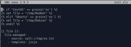 Luodaan init.sls tiedostoon muutama IF-lause. Tiedosto näyttää seuraavalta: