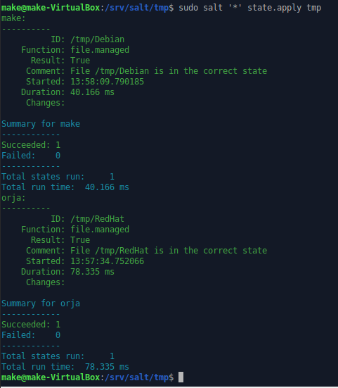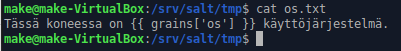 Aloitetaan tekemällä /srv/salt kansioon /tmp kansio ja luodaan tähän samaiseen kansioon init.sls tiedosto ja os.txt teidosto.