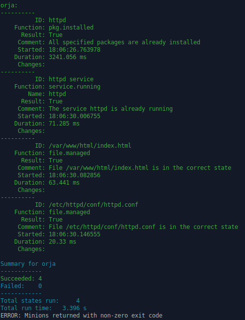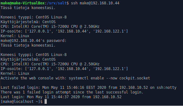 Tämän jälkeen otetaan uudet tiedot käyttöön käynnistämällä uudestaan salt-minion (CentOS koneessa) ja salt-master (master koneessa.