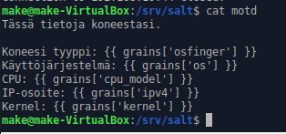 c) Tee päivän viesti (motd), jossa koneen tyyppi tulee grains osfinger -muuttujasta. Kokeile, että saat eri levityspaketeilla eri tuloksen. Voit hyödyntää aiemmin tekemääsi motd:ia.