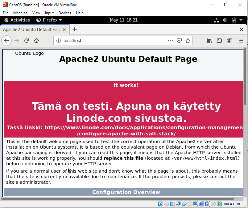 Apache2 ei pyöri Xubuntulla, koska siellä on taustalla Nginx, mutta muuten kaikki toimii loistavasti. Seuraavaksi testaan tulos menemällä CentOS konellaa apache2 palvelimen etusivulle menemällä localhost:lle.
